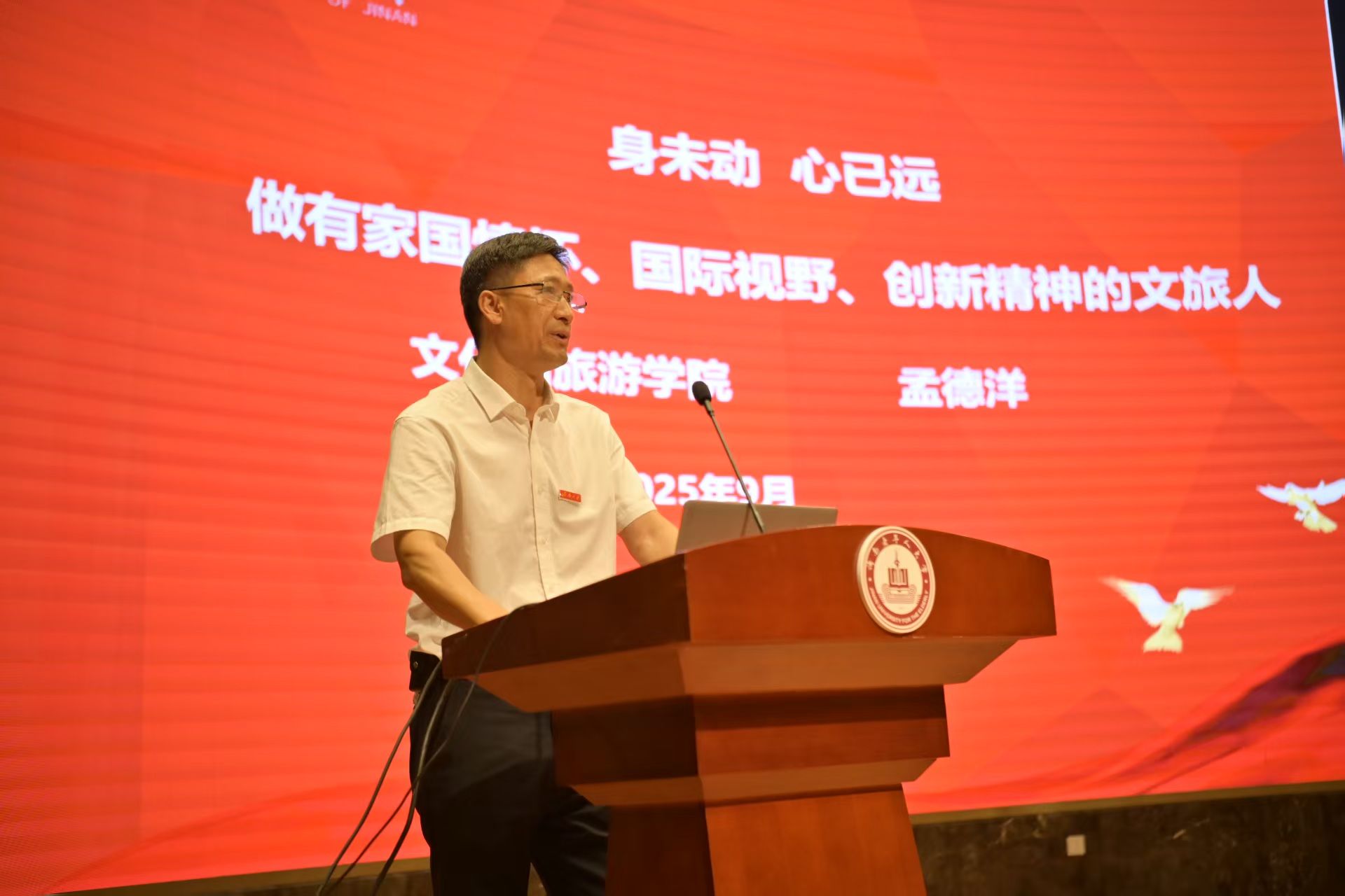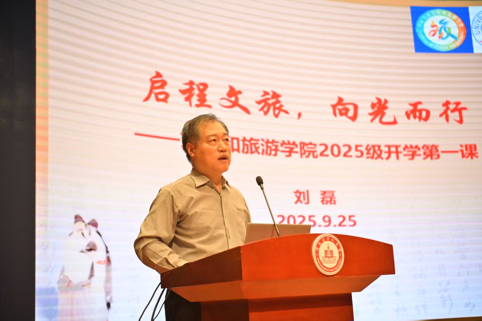 刘磊院长以《启程文旅,向光而行》为主题,为学子们展现了专业的广阔前景。他紧密结合当前文旅产业的发展新趋势,深刻剖析了行业所面临的机遇与挑战,指明了文旅人肩负的时代使命。通过分享数位杰出校友的奋斗故事与卓越成就,有力地诠释了专业的实践价值与社会意义,激励新生们满怀信心地开启专业学习之旅。