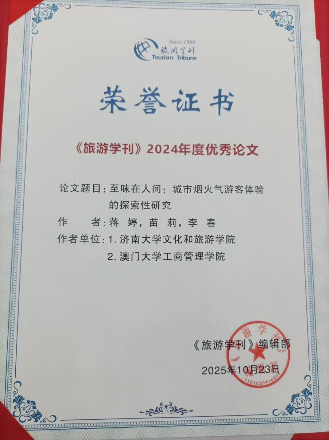近日,在西安结束的2025《旅游学刊》中国旅游研究年会上,由编委组成的论文评审委员会多轮评选,遴选出2024年《旅游学刊》年度优秀论文10篇。我院蒋婷教授和其研究团队撰写的论文《至味在人间:城市烟火气游客体验的探索性研究》,被评为2024《旅游学刊》年度优秀论文。