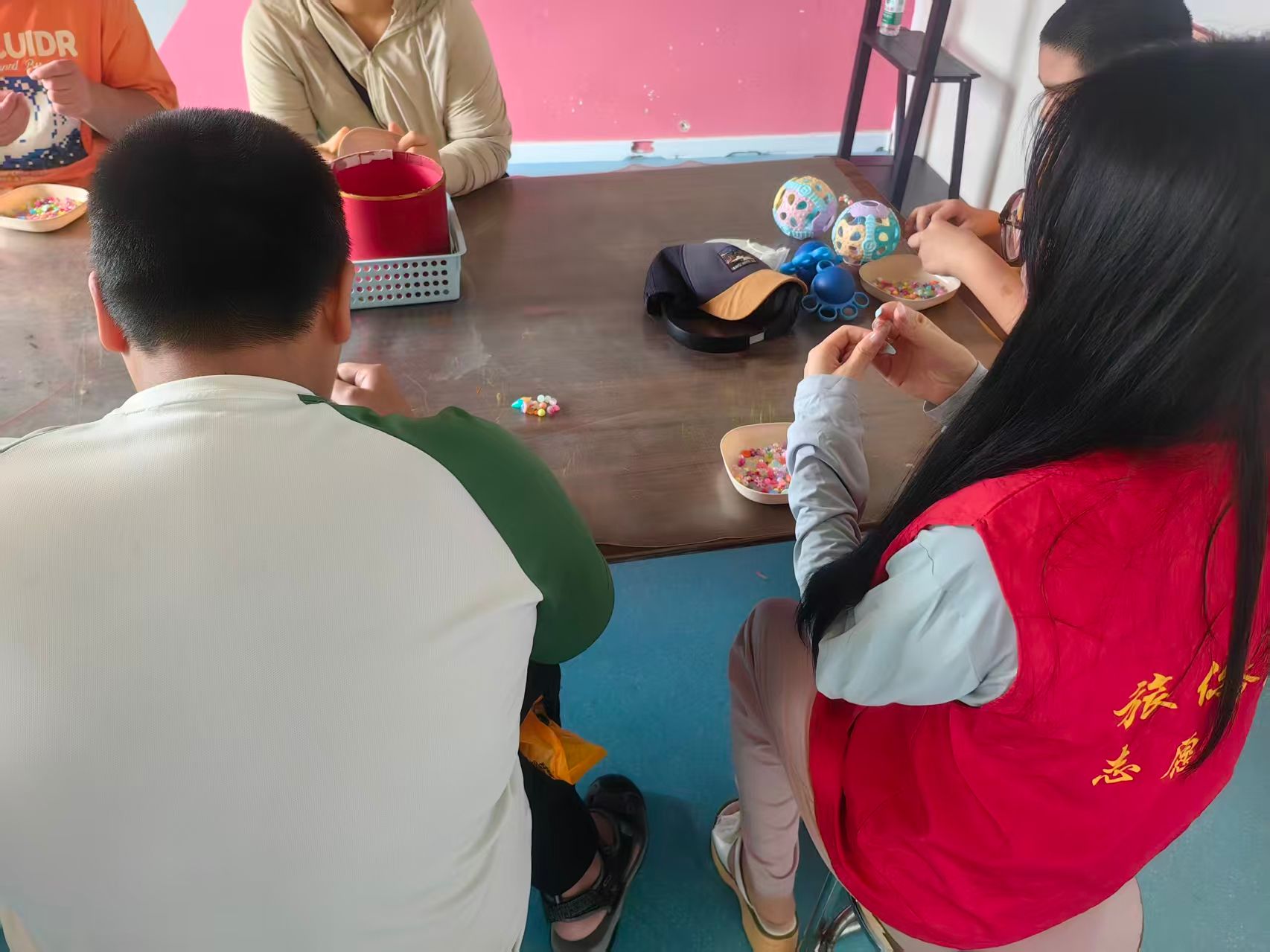 “指尖魔法 —— 手工串珠课堂” 率先拉开帷幕。志愿者将提前准备好的材料包分发给每个孩子:柔软的彩色棉绳和圆润的琉璃珠,这些物品瞬间勾起了孩子们的好奇心。志愿者刘思彤手持材料,一边慢速示范,一边用温柔的语气讲解步骤,还特意强调 “颜色搭配可以随心所欲,喜欢的样子就是最好的样子”。孩子们听得格外认真,半小时后,一条条形态各异的手链陆续完成。孩子们举起手腕上的作品,对着镜子反复欣赏,脸上的笑容比手中的珠子还要明亮。
