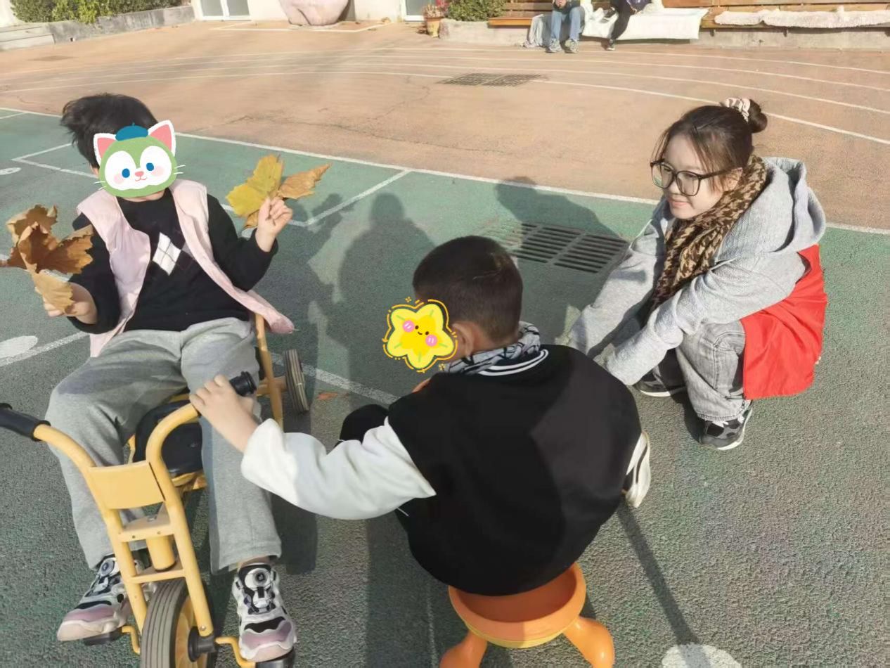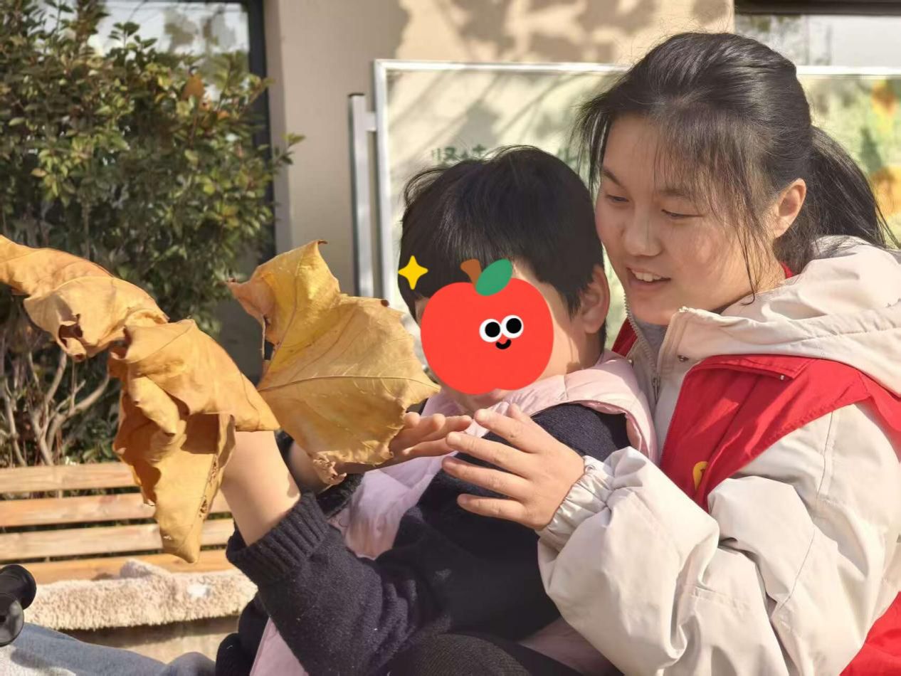 暖阳倾泻的活动场地,是童心与善意的栖息地。志愿者轻坐儿童小车,将孩子温柔拥入怀中,车轮轻转,清脆的笑声在暖阳下回荡;孩子掌心的落叶,是自然馈赠的礼物,在指尖翻飞间,漾开最纯粹的笑意。志愿者俯身屈膝,与执叶的孩子静静对视,眼底的柔光化作桥梁,轻轻走进“星星的世界”。风拂过发梢,叶影斑驳间,孩子的笑声似银铃般清脆,漫过时光,也漫进志愿者的心底。“哪怕只是并肩静握一片落叶,都觉得是在和他们的世界轻轻相连。” 志愿者吴琴的话语,恰是这场陪伴最动人的注脚。