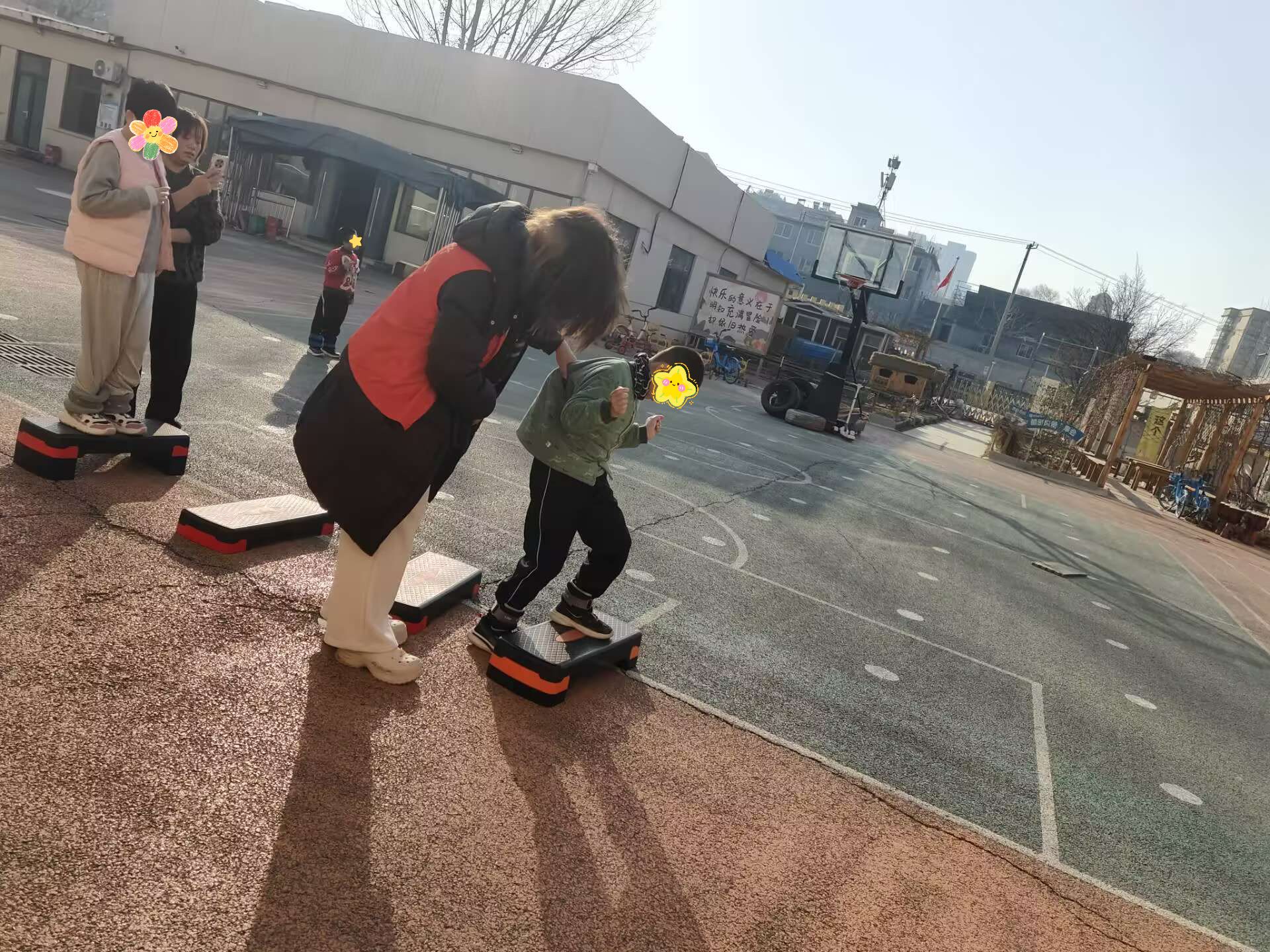 初见时的腼腆与疏离,在志愿者温柔的笑容与耐心的陪伴中逐渐消散。跑道上,志愿者们轻轻牵着孩子们的小手,并肩漫步,每一个脚印都是信任的传递,每一声轻语都是温柔的守护;平衡踏板前,志愿者屈膝俯身,手把手引导孩子们调整姿态、稳住重心,在一次次尝试与鼓励中,孩子们努力突破自我、提升身体协调能力.他们的小小身影,让时光变得柔软而珍贵。